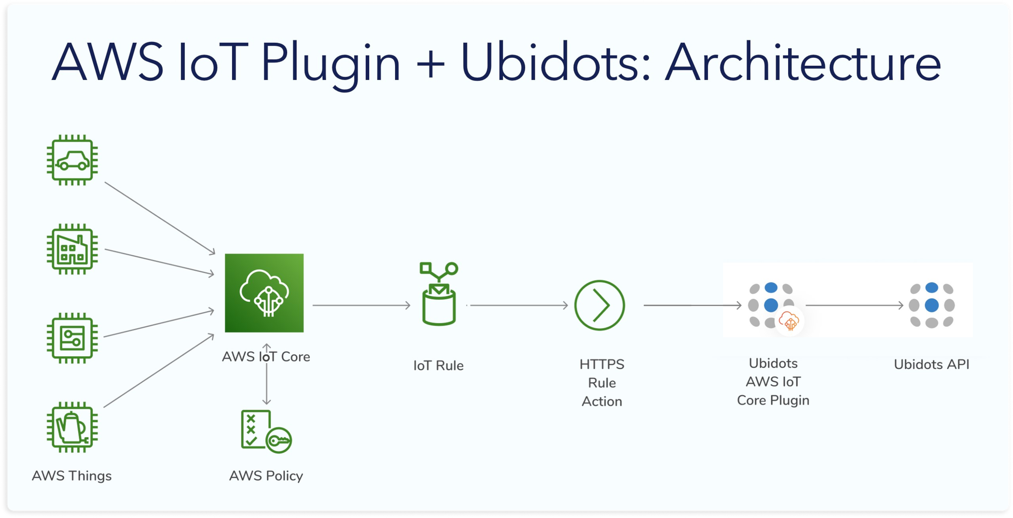 From there, AWS triggers an HTTPS action—a webhook that routes data directly to an Ubidots plugin. The AWS IoT Core Plugin in Ubidots offers a simple yet powerful way to connect your AWS-connected devices to Ubidots without writing custom integrations or managing infrastructure. Once set up, the plugin automatically handles the secure reception of data from AWS IoT Core, decodes payloads, and creates devices and variables on the fly. It processes incoming data using a customizable decoder and makes it easy to manage entire fleets and visualize metrics.